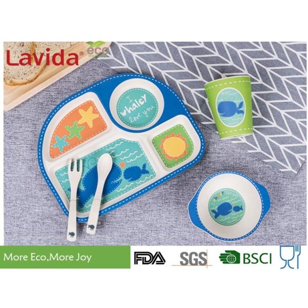 Eco Bamboo Childrens Dinner Set 4 Sections Plate Glass Fork / Spoon Shatter Proof Images |